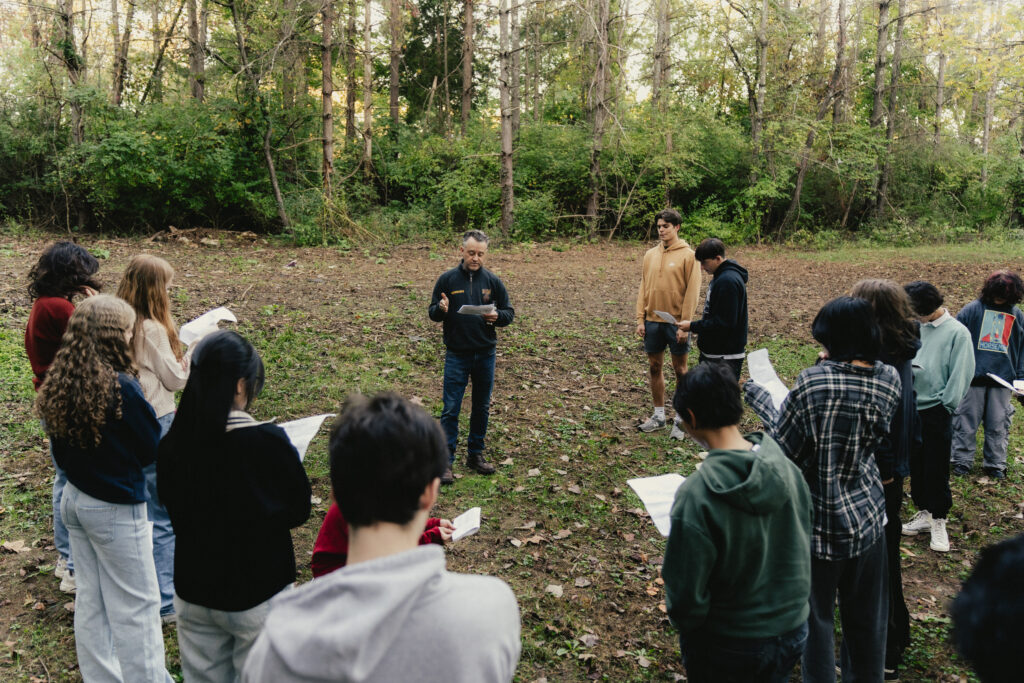 This photograph, the dominant on its spread, is balanced, shows students engaged in an activity, and shows the setting. I like its simplicity and calmness, which somewhat aligns with transcendentalism. I do think it would be a stronger photograph if I went around, behind the teacher, to capture the students’ faces. My excuse is that I was a student in this class, and was supposed to be following along with the text, not taking photographs.