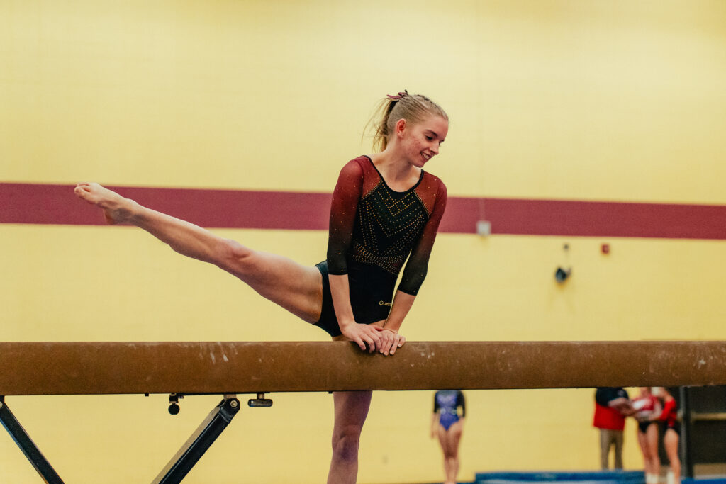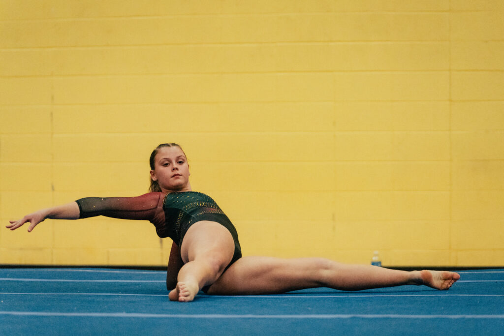 This photograph shows the gymnast smiling as she mounts the beam. While I’ve taken plenty of frozen-action shots, where gymnasts are in the middle of tumbles or jumps, this photo shows this gymnasts personality in a way that isn’t as clear in those others. The (mostly) clean background makes it pleasing to the eye, and this spread serves as a great dominant on the gymnastics spread.