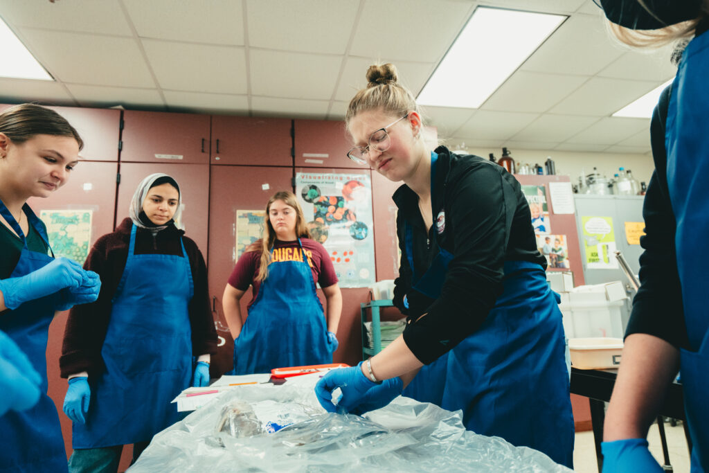 I love this photograph it clearly show’s the subject’s emotion: disgust. The room certainly didn’t have a pleasant smell, and my use of a wide-angle lens to capture multiple students around the table meant I was pretty close to the action.