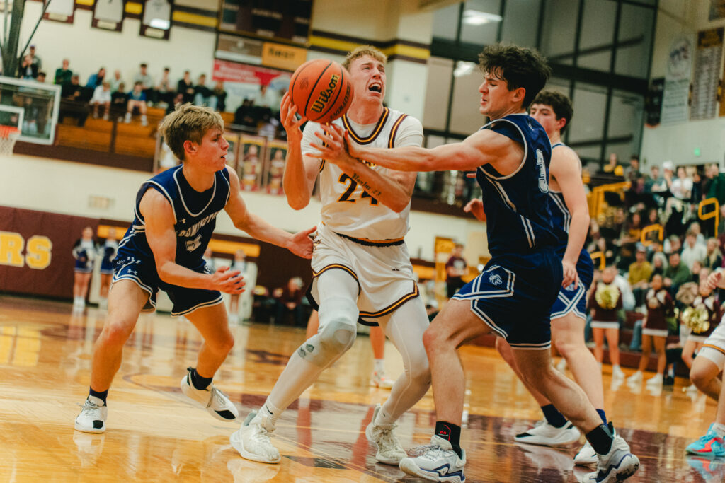 This photograph is the dominant on the yearbook basketball spread. It shows our school successfully shooting against the other team. The composition includes the basket, showing scale and distance. This gym was tricky to shoot in due to student crowds behind each basket, so I was sitting right in front of a group of loud and excited students cheering for their team. I like the action and clarity this photograph contains.